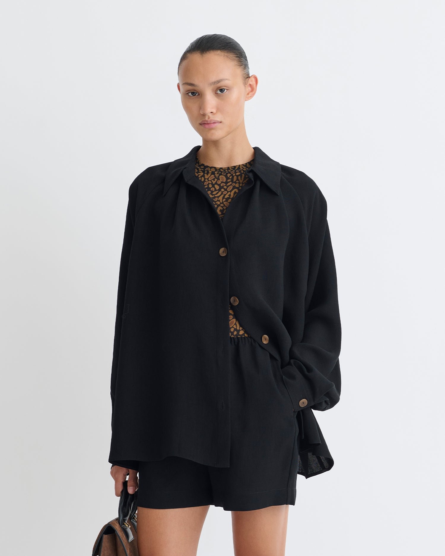 Az Ada ing a RECRAFTED kapszulakollekciónk része, amely felesleges anyagokat alakít át új, elegáns darabokká. Szezonális stílus, újrahasznosított fekete tech lenvászonból készült a laza szabás érdekében.