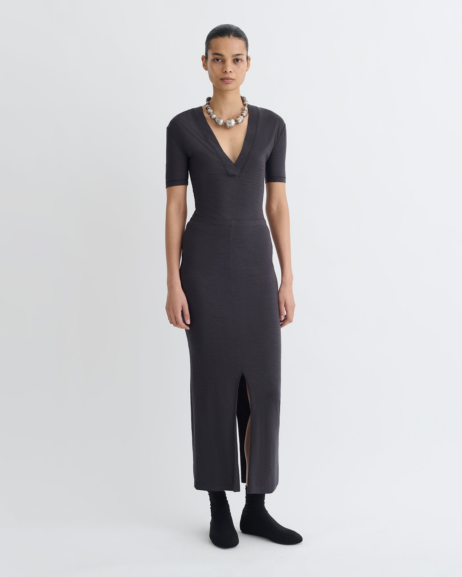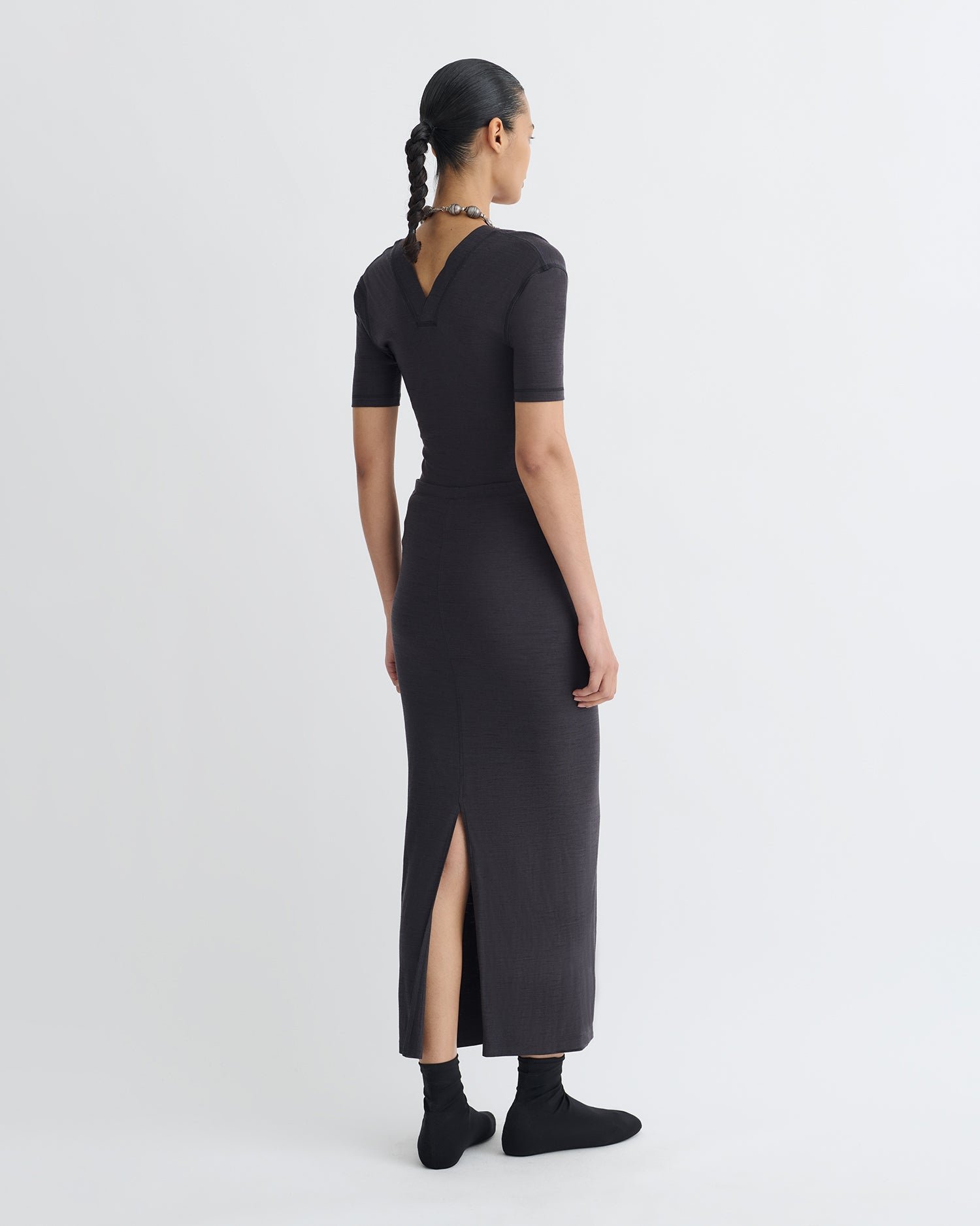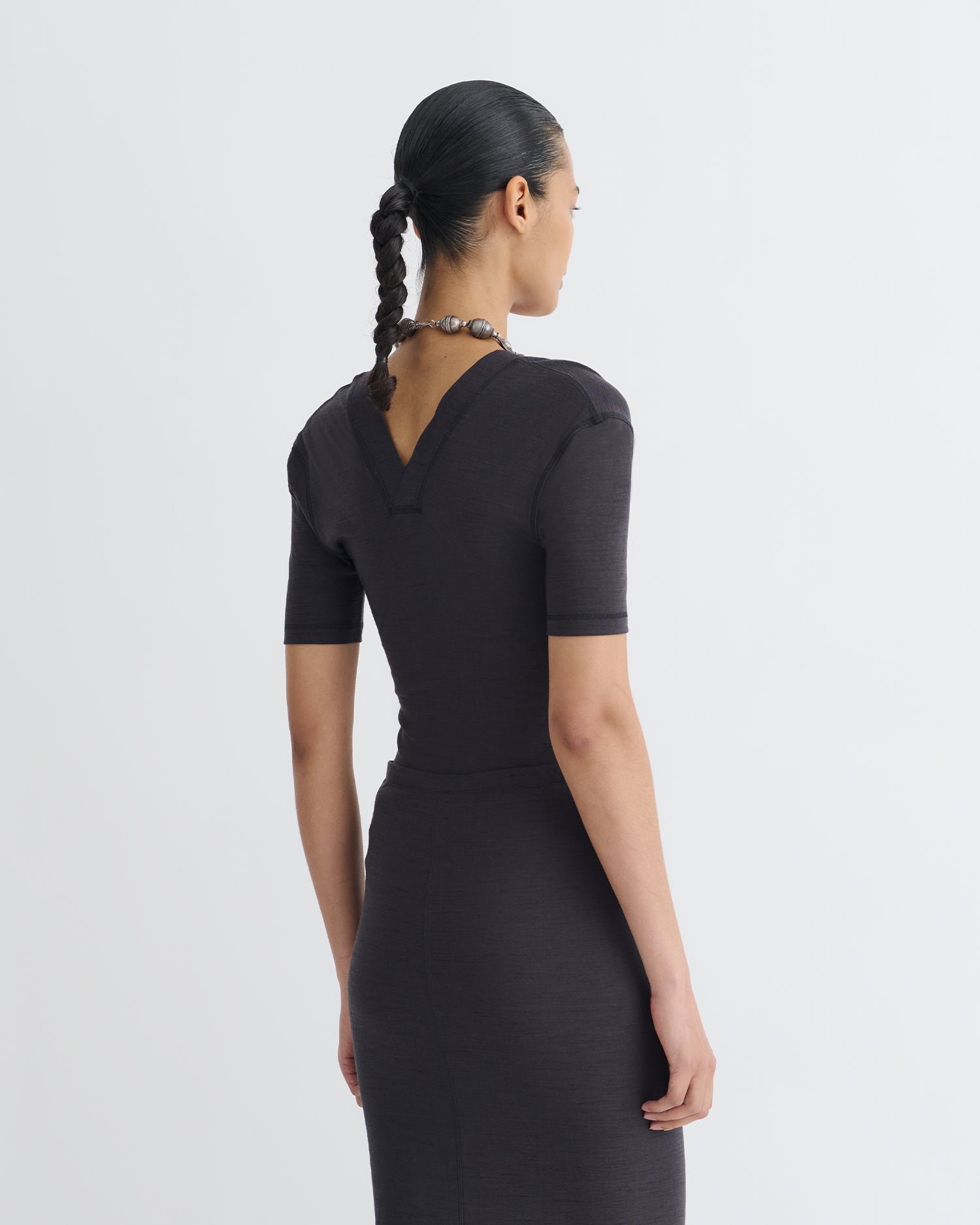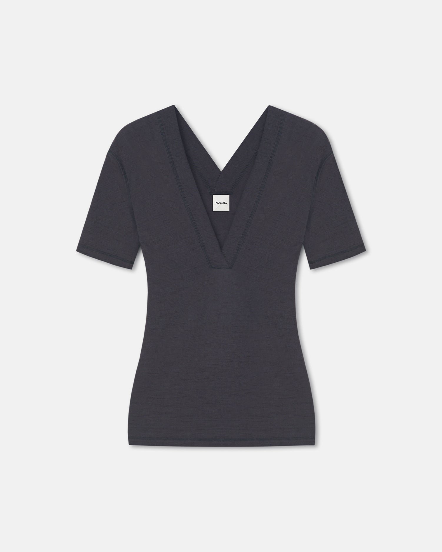 A sport esztétikája inspirál minket, mivel ötvözi a kifinomultságot és a funkcionalitást. Jól példázza ezt az Akka felső, amely puha gyapjú jerseyből készült, henley stílusú gombolással. A hozzá illő oszlopos szoknyával visszafogottan kifinomult megjelenést kölcsönözhetsz neki.