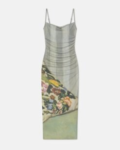 Az Alexa ruhadarab jellegzetes hálós jersey anyagunkból készült, amely fodrosan körbeöleli a testet. Midi hosszának köszönhetően sokoldalúan viselhető, és Fényes Adolf Könyvek című festményével van nyomtatva.