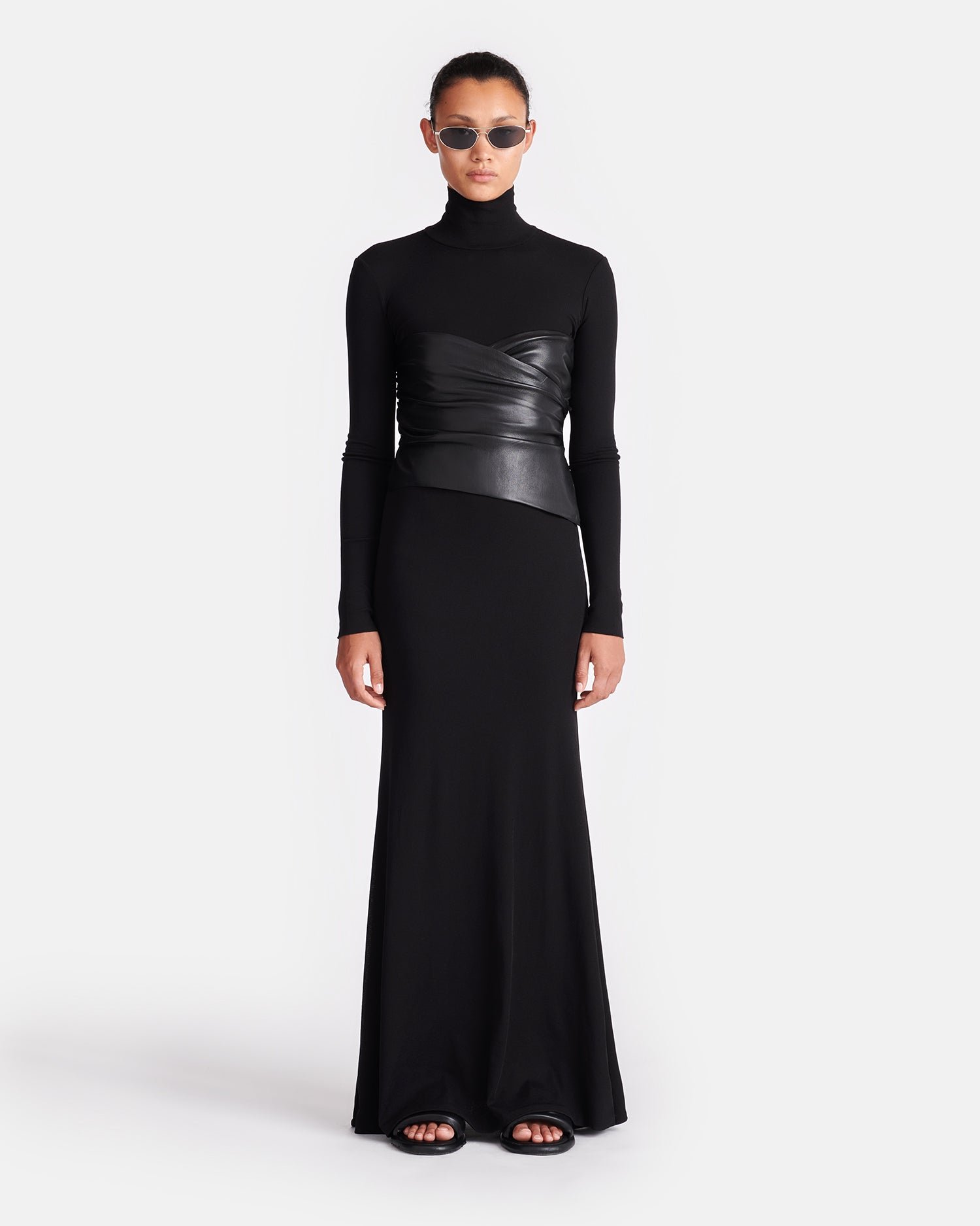 Az Amabel ruha a visszafogott sziluettek modern megközelítését testreszabja. Fekete hálós jersey anyagból készült a testhez simuló szabás érdekében, és egy drapézott Okobor™ műbőr melltartó panellel van kiegészítve, amely tovább hangsúlyozza az alakot.