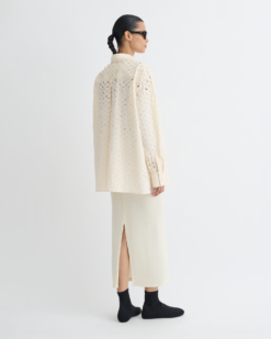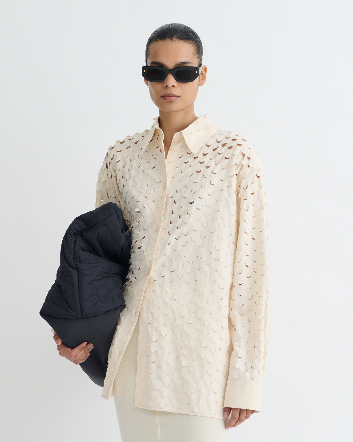 Az Aphea ing krémszínű, vastag puplinból készült, lézerrel kivágott. Könnyű és túlméretezett, így tökéletes ellenpontja a letisztult, különálló daraboknak.