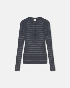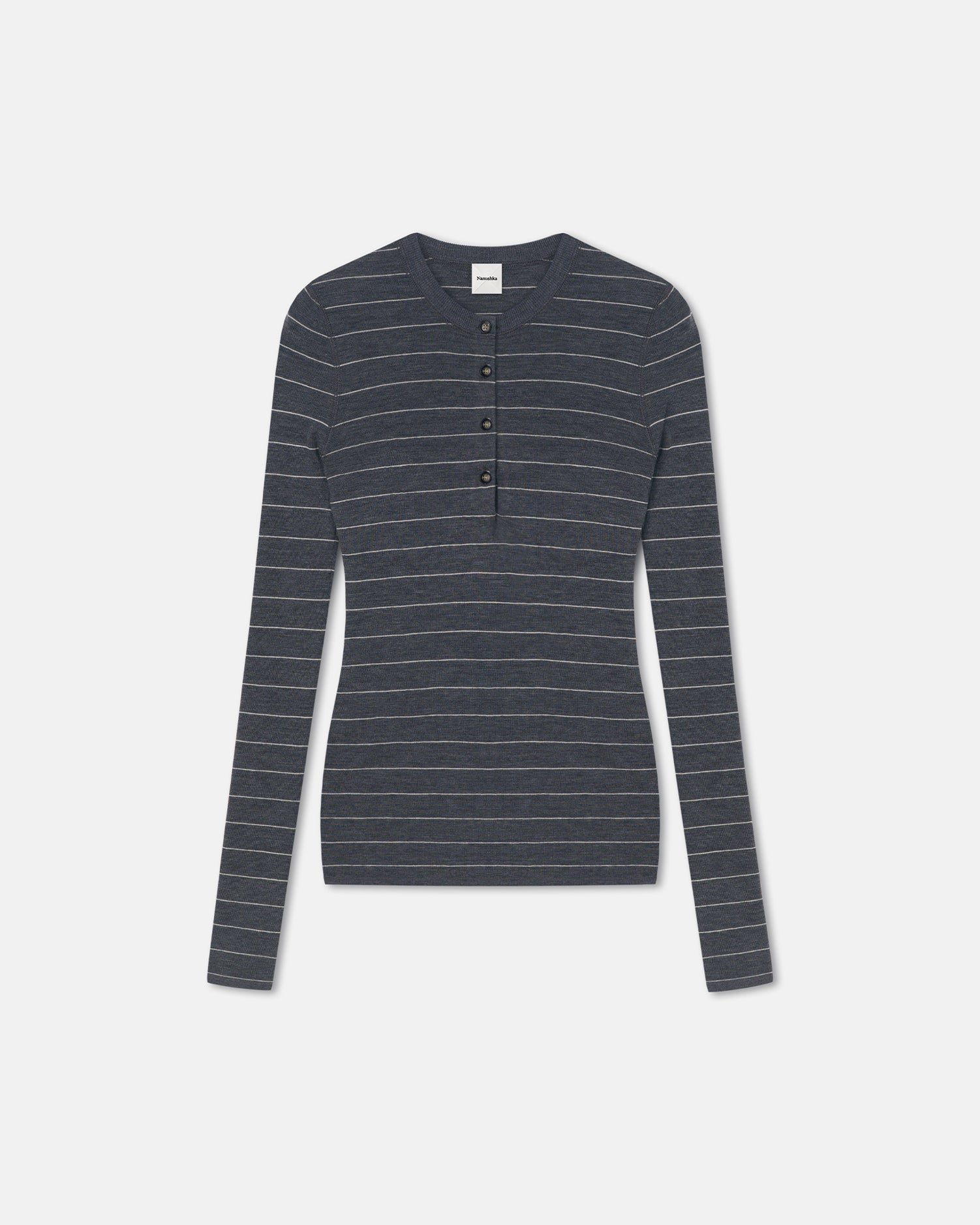 Az Ariyah felső a sport esztétikájából merít ihletet. Szuperpuha frottír merinóból készült, finom szürke csíkokkal és henley sziluettel.