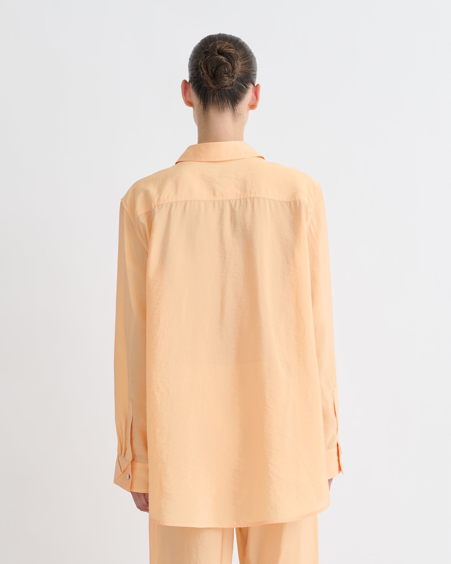 A Nanushka Arleen ing modern szellemben képzeli újra a klasszikus ingviseletet. Légies krepp organzából készült, túlméretezett sziluettje és strukturált vállai folyékony volument hoznak létre anélkül, hogy elveszítenék az alakjukat. Élénk barackszínű árnyalatában könnyed eleganciát és sokoldalúságot kínál.
