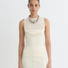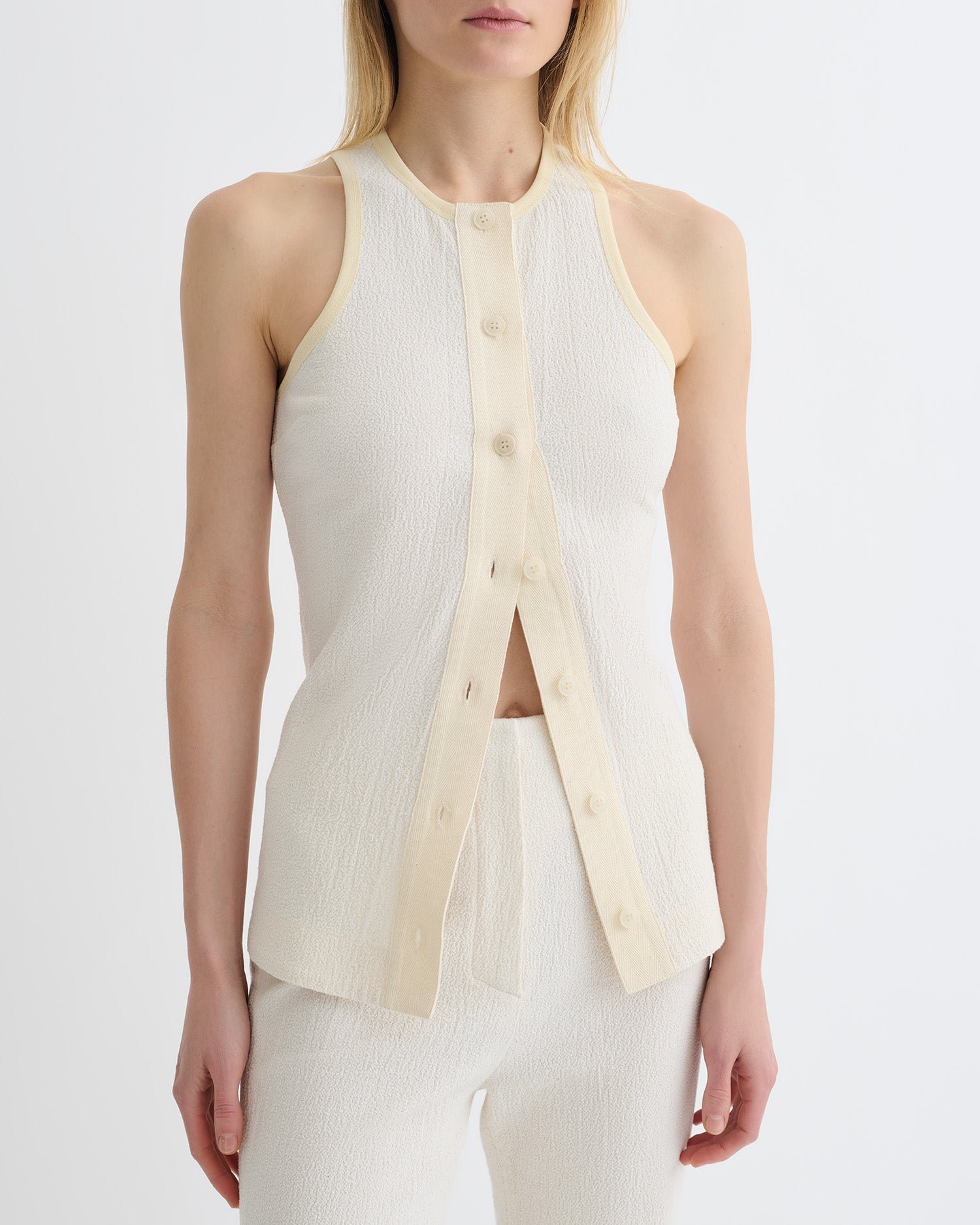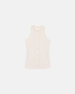 Az Arne felső a tank top egy magasabb szintű változata. Enyhén texturált krepp melanzs anyagból készült, és a gombos nyílásnak köszönhetően kifinomultságot kölcsönöz.