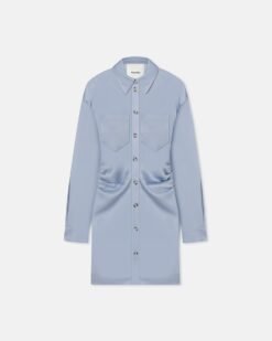 Az Arona ruha klasszikus ingstílusok mintájára készült, de drapézott sziluettjének köszönhetően összetéveszthetetlenül Nanushka. Folyékony állagú, csillámos kék színű szatén anyagból készült.