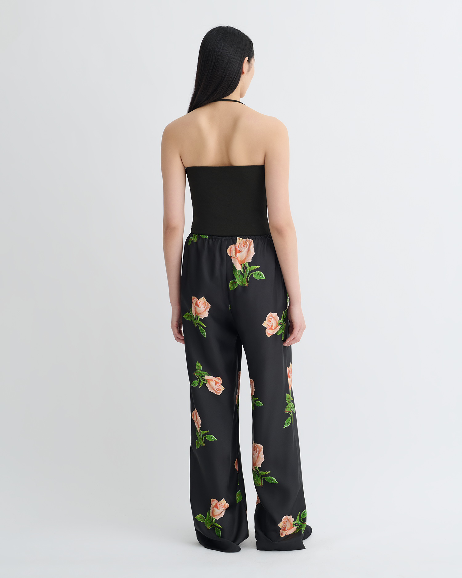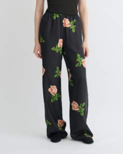 Az Arvenn nadrágot élénk rózsaszín motívumok díszítik, amelyeket a régi magyar bélyegek ihlettek. Könnyen viselhető a folyékony selyemszövetnek, a gumírozott deréknak és a laza szárnak köszönhetően.