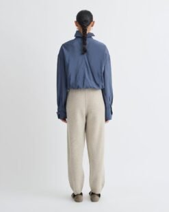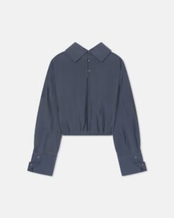 A Nanushka Aurore ing a laza kifinomultságot testesíti meg. Légies krepp organzából készült, magas nyakú, dobozszerű ing, amely az éles struktúrát folyékony könnyedséggel ötvözi. Farmerkék színben a praktikumot és az eleganciát ötvözi, így egy sokoldalú ruhatári darab, amely könnyedén átmeneteket biztosít.