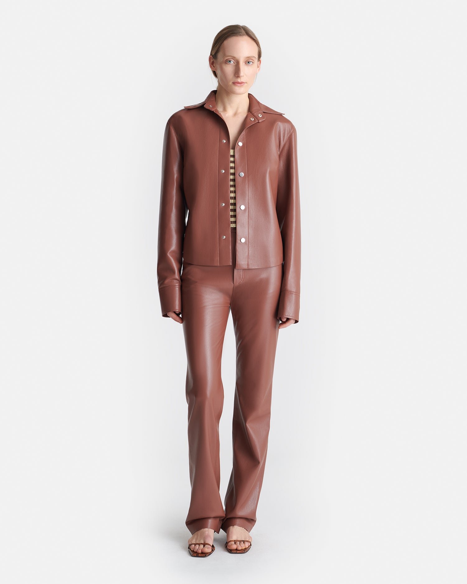 A Bogna ingkabát exkluzív OKOBOR™ műbőr anyagunkból készült, és új henna árnyalatban kapható a 2025-ös tavaszi/nyári kollekcióban. Karcsúsított szabása révén rétegezhető vagy önmagában is viselhető, és kizárólag ezüst színű szerelékekkel díszített.