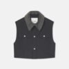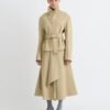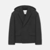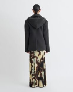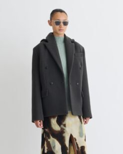 A Brione blézer mélyzöld árnyalatú, antikolt nemezelt gyapjúból készült, levehető kapucnival és túlméretezett szabással rendelkezik. Ez a darab megtestesíti az őszi-téli 25-ös kollekció azon megközelítését, amely az átmeneti szabásmintákat építészeti éllel ötvözi.