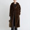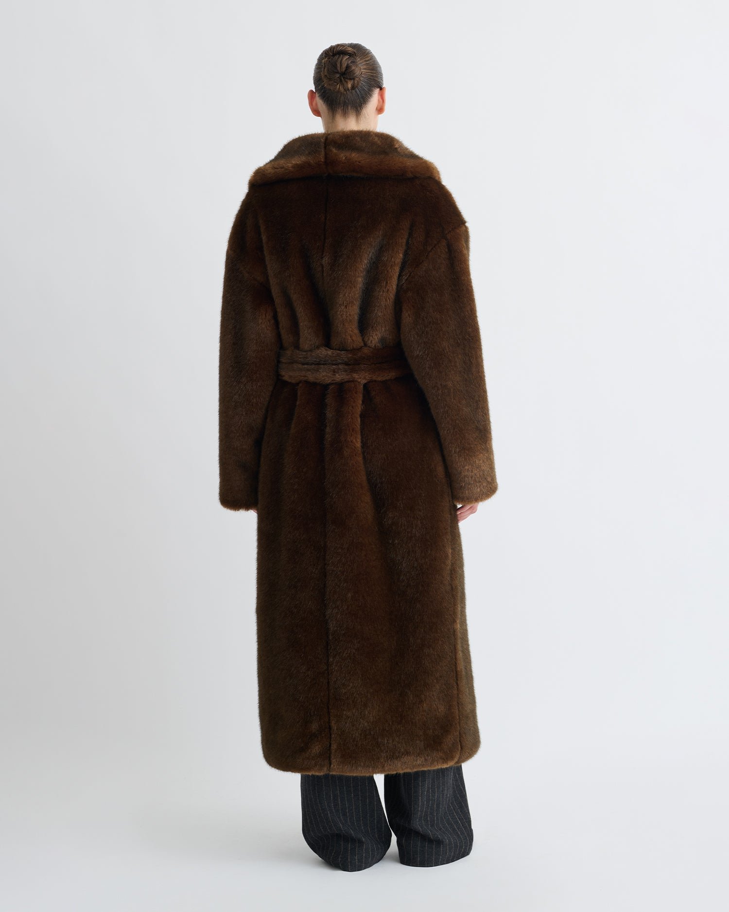 A Cariana kabát a felsőruházatot a csendes luxus kifejezésévé varázsolja. Pazar műszőrméből készült, ez a sálgalléros köntös sziluettje túlméretezett, mégis kifinomult. Sötétbarna színe kényelmet és erőt sugároz, így egy tartós darabot hoz létre, amely a hatalom növelésére szolgál.