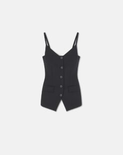 A Cinda felső elölről megtévesztően egyszerűnek tűnik – éles szabású, gombos rögzítésű és derékban zsebfedős –, de a hátulján egy nyitott rész látható, ami egyedien Nanushka.