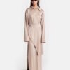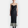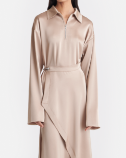 A Colter slip szatén midi ruha drapériája egyszerre friss és elegáns. Cipzáras nyakkivágással és derékrészen csattal rendelkezik – motoros ihletésű részletek, amelyek hangsúlyozzák a modern hangulatot.