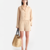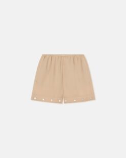A Dylla rövidnadrág áttetsző gézből készült, meleg viaszos árnyalatban. Magas derekú, húzózsinóros megkötőkkel a rugalmasság érdekében, és csillogó ezüst szegecsekkel az alján.
