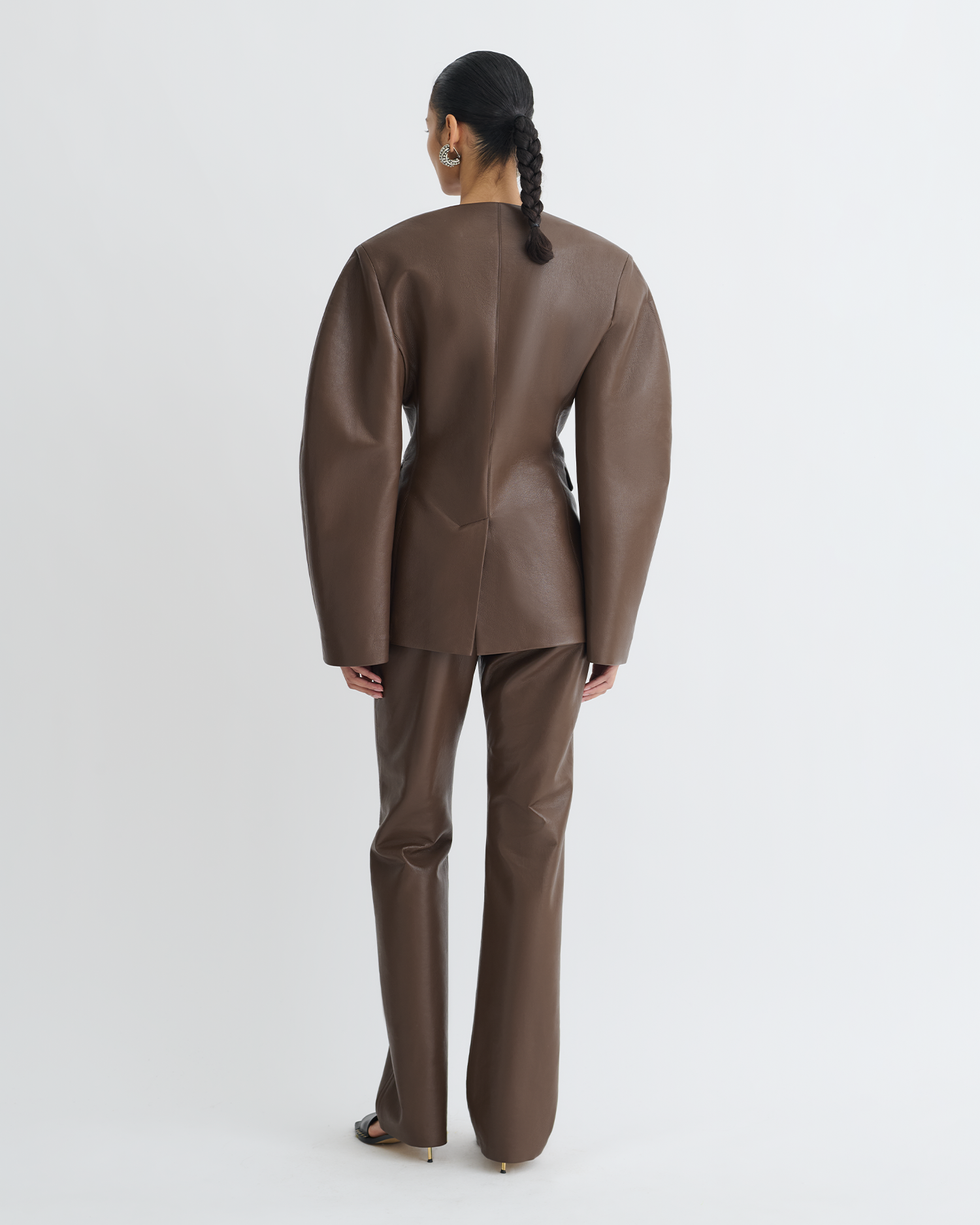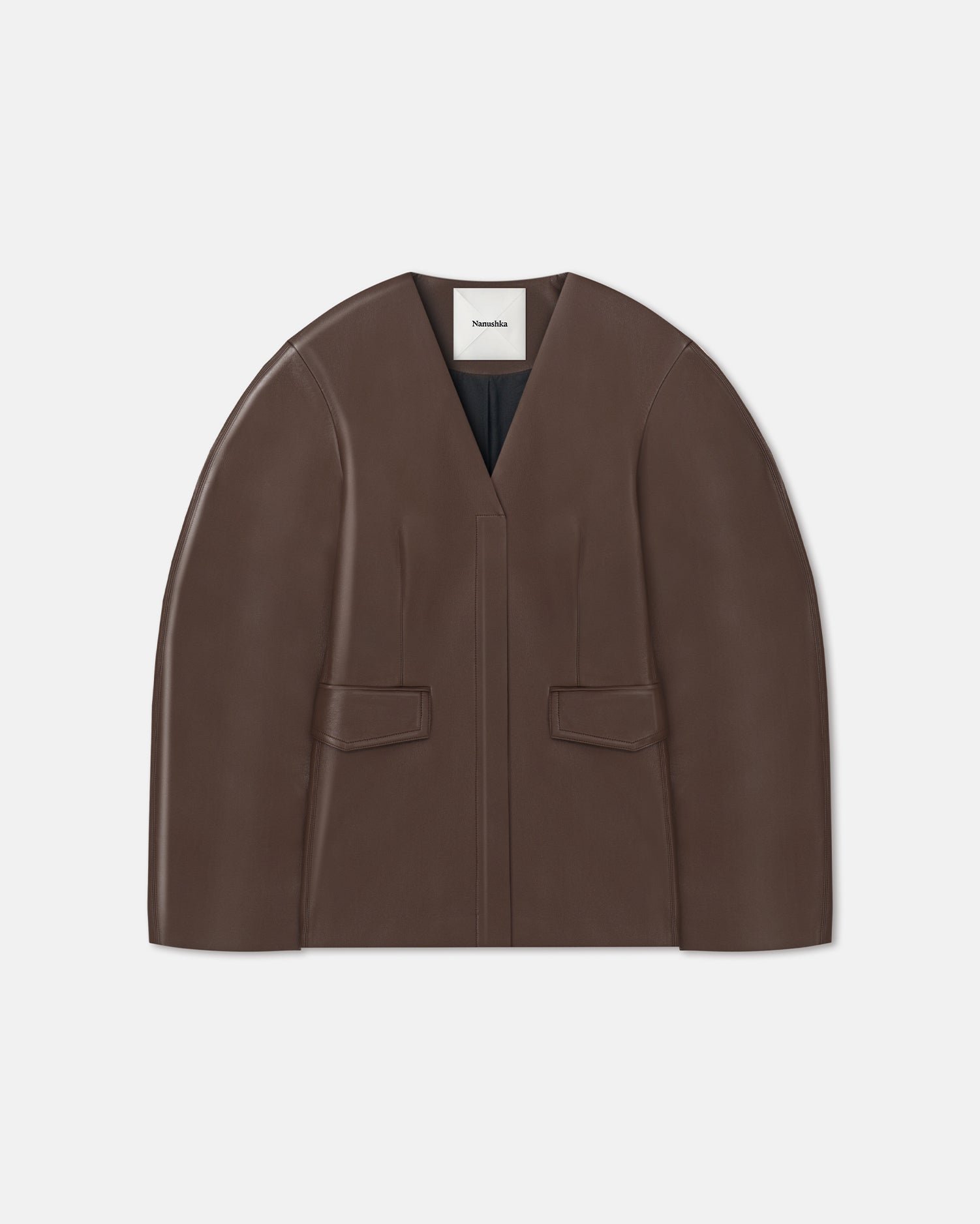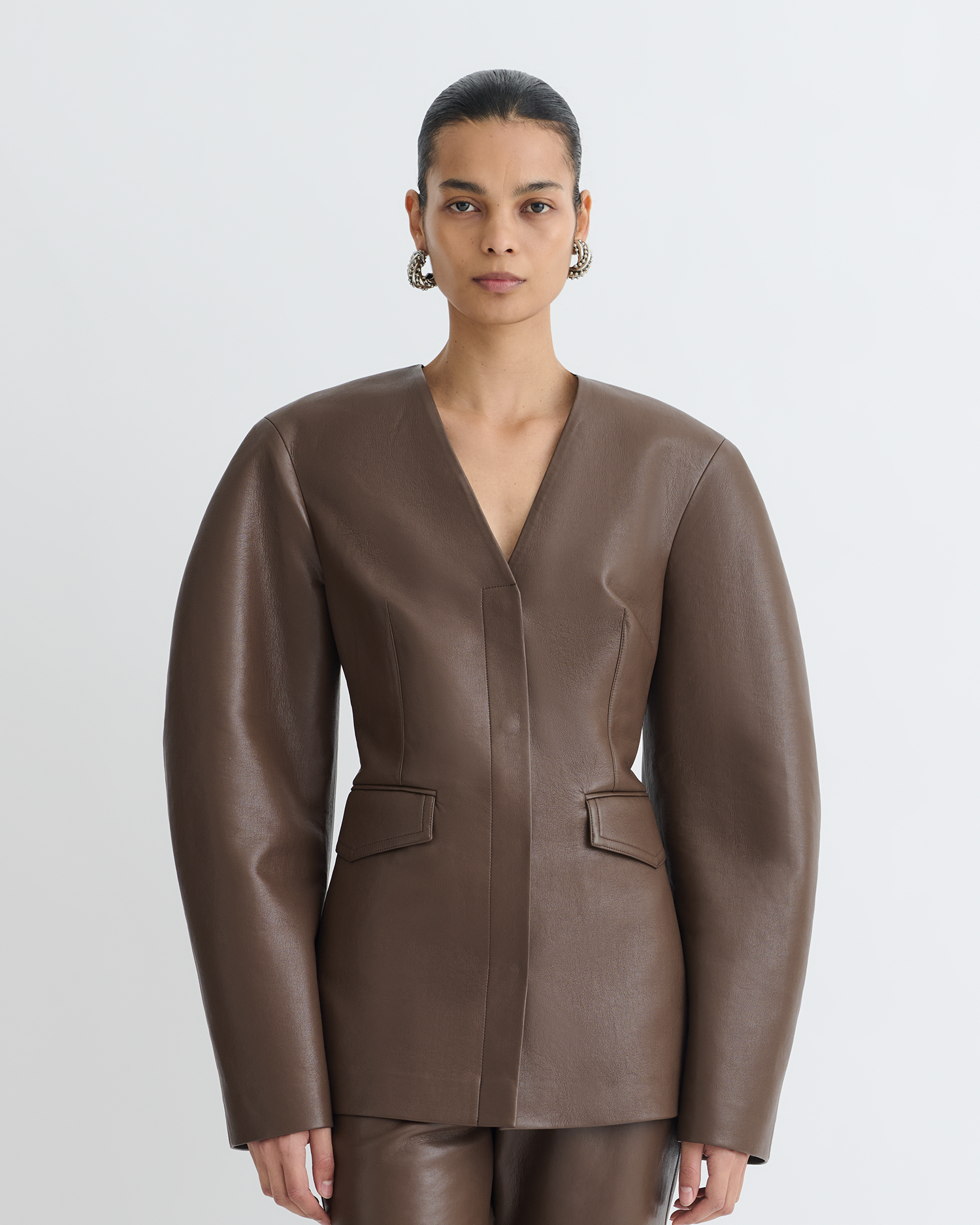 Az Erina kabát szakértők által szabott, regenerált bőrből, gazdag csokoládé árnyalatban. A kézművesség és az egyszerűség elismerését tükrözi, gallér nélküli, rejtett gombos kialakítással, bevarrt derékkal és lekerekített ujjakkal.