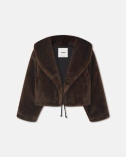 A Nanushka Estel kabátja körülölelő melegséget és fokozott könnyedséget biztosít. Puha műszőrméből készült, túlméretezett, sálgallérral ellátott kabát puhasággal öleli körül a testet, miközben megőrzi szoborszerű formáját. Sötétbarna színben a védelem beburkoló érzését és a magabiztos kifinomultságot testesíti meg.