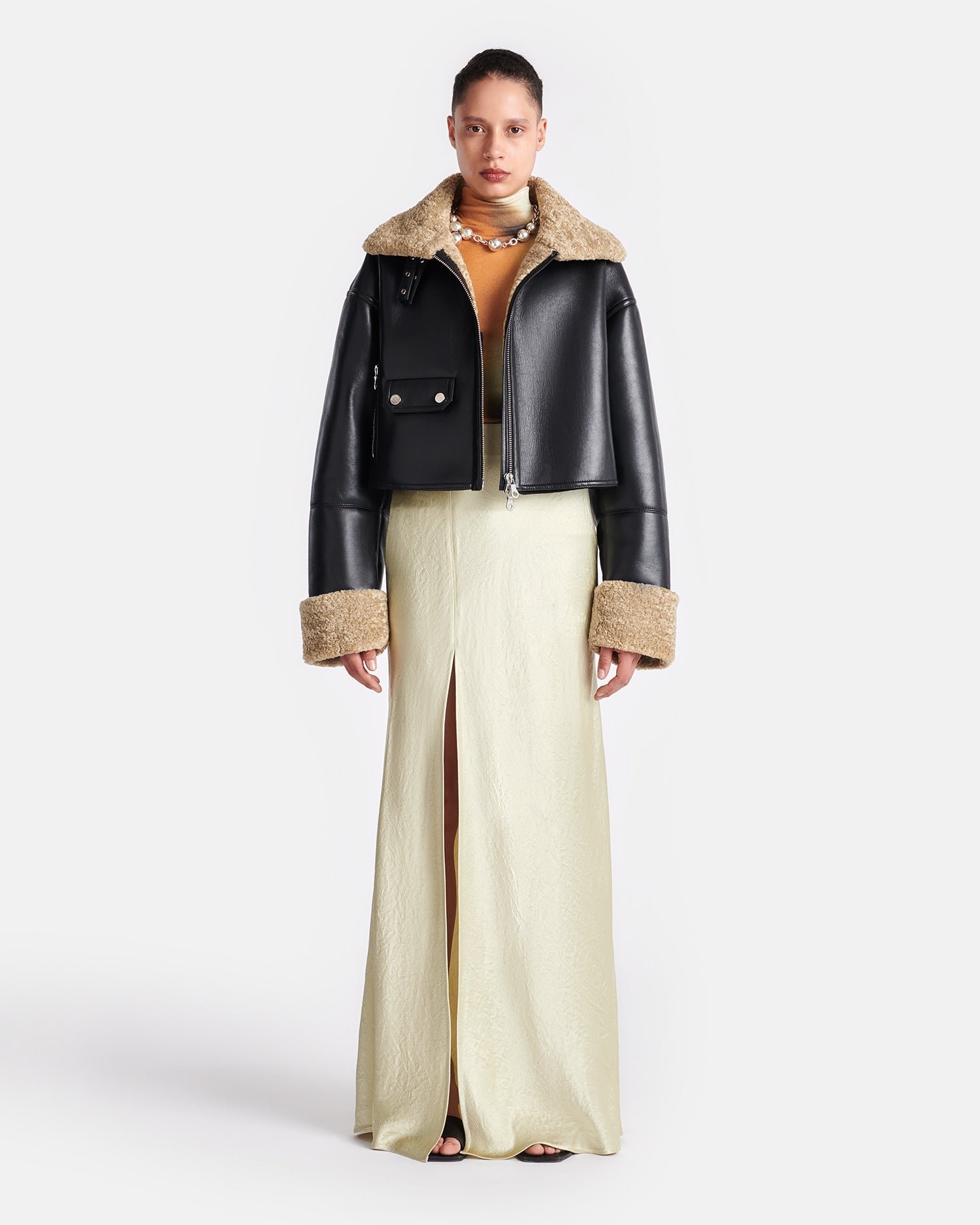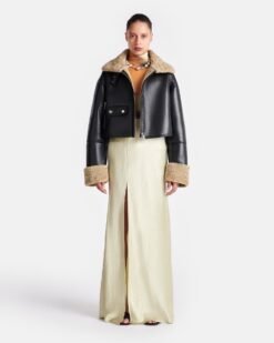 A Jemma kabát regenerált fekete bőrből készült, ragasztott báránybőr béléssel és kontrasztos kukoricaszár mandzsettával. Minden klasszikus pilóta stílusjegyével rendelkezik – tölcsérnyak és számos zseb –, de modern megjelenésű, rövidített fazonnal.