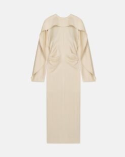 A Nanushka Jil ruhája újraértelmezi a klasszikus eleganciánkat. Ropogós szaténból készült, testhezálló midi ruha, melyet pilgrimgallér és strukturált drapéria jellemez. Az ekrü szaténból készült, időtálló darab az évszaktól független kifinomultságért.