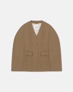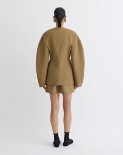 A Nanushka szabás a könnyedségről és az eleganciáról szól. A Kaori blézer friss és modern hatást kelt gallér nélküli kialakításának, hosszúkás sziluettjének és lekerekített ujjainak köszönhetően. Mélybarna színben a hozzá illő szabású nadrággal viselhető.