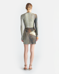 A Leida ruhát Fényes Adolf magyar művész Könyvek című festménye díszíti. Hálós jersey anyagból készült a testhezálló szabás érdekében, hosszú ujjakkal, hogy ellensúlyozza a combközépig érő hosszt.