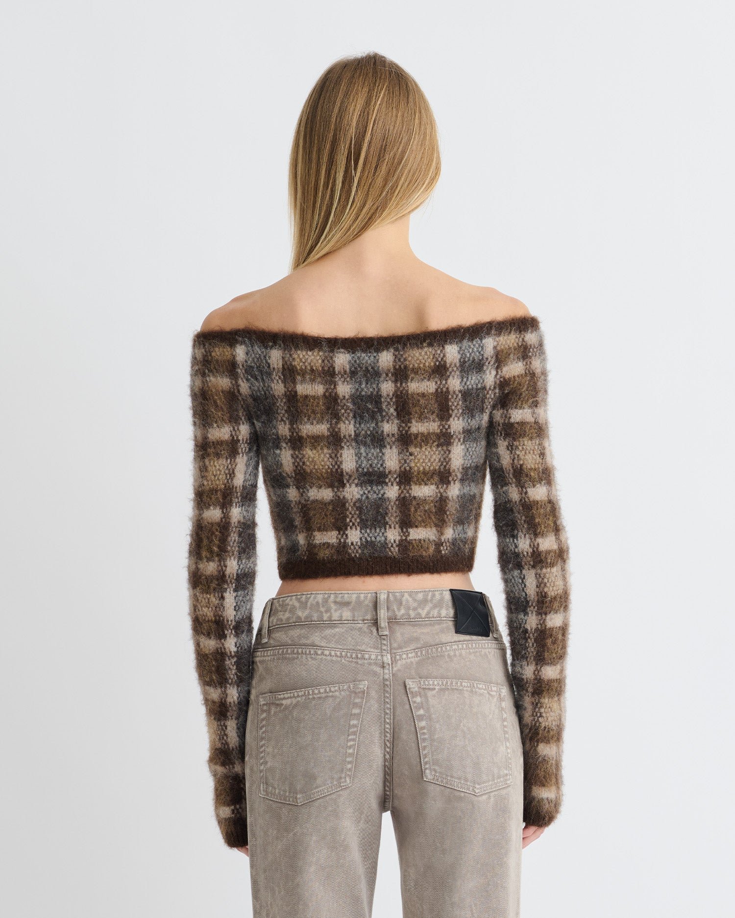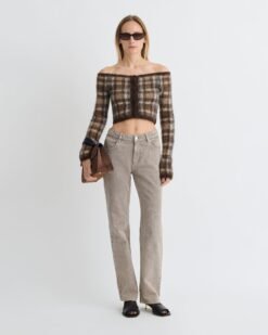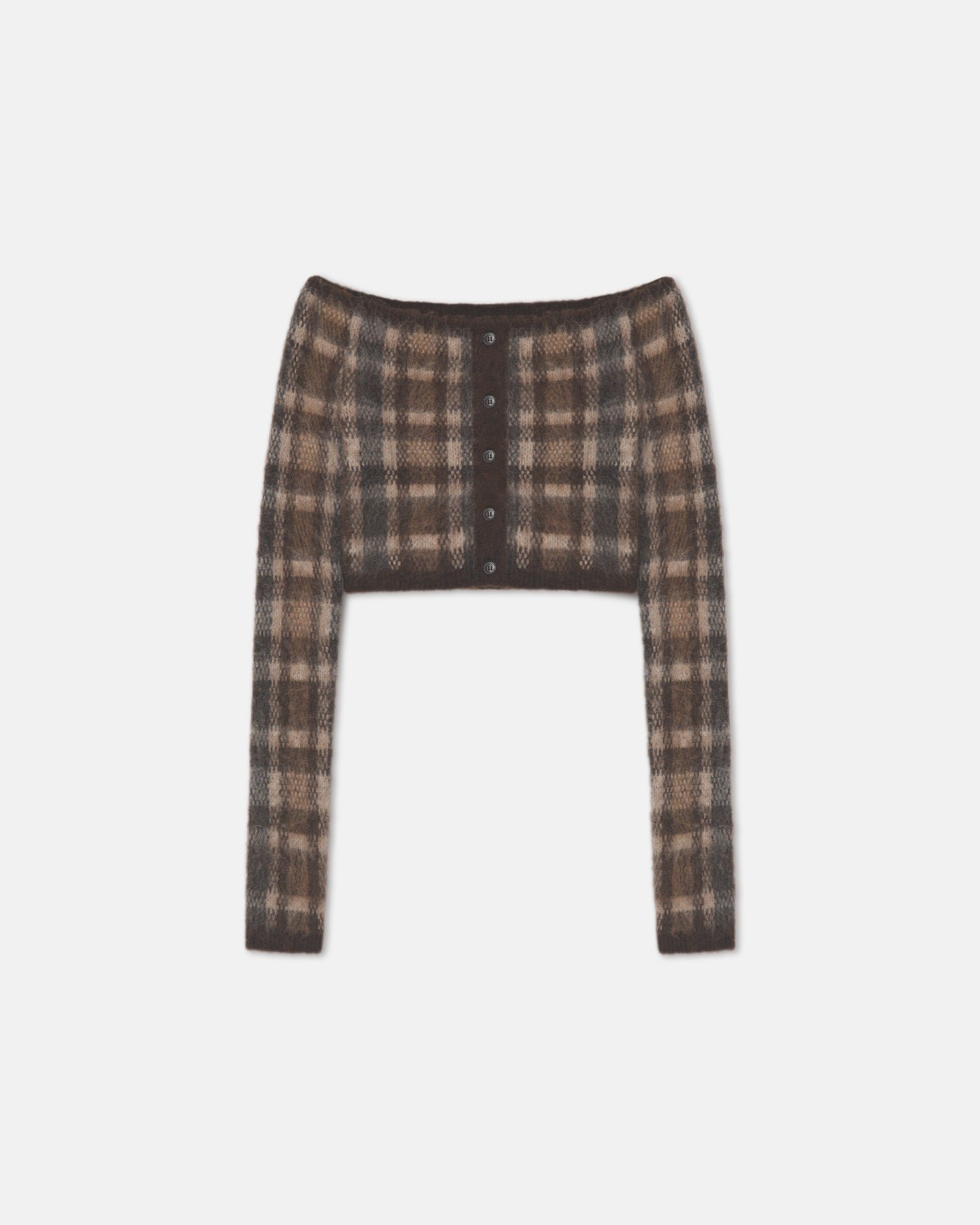 A Nanushka Liliah kardigánja újraértelmezi a klasszikus kötöttárut egy csipetnyi modern érzékiséggel. Kefélt alpaka gyapjúból fonva, ez a rövidített, váll nélküli kardigán melegséggel és puhasággal öleli körül a testet. A barna és krémszínű kockás minta földszínű kifinomultságot kölcsönöz, amely visszhangozza az őszi-téli kollekció erőteljes, sokoldalú nőiességről alkotott elképzelését.