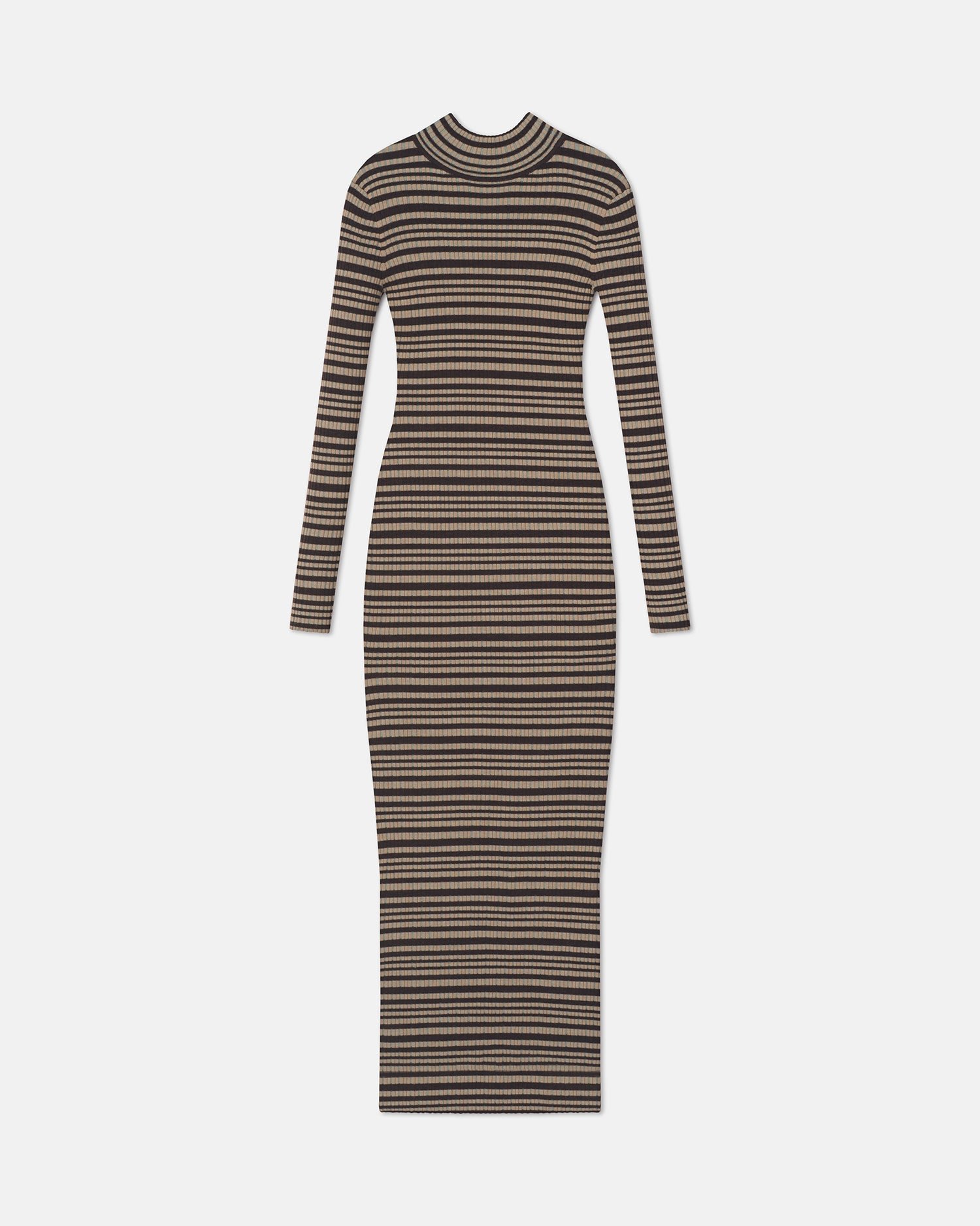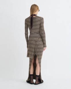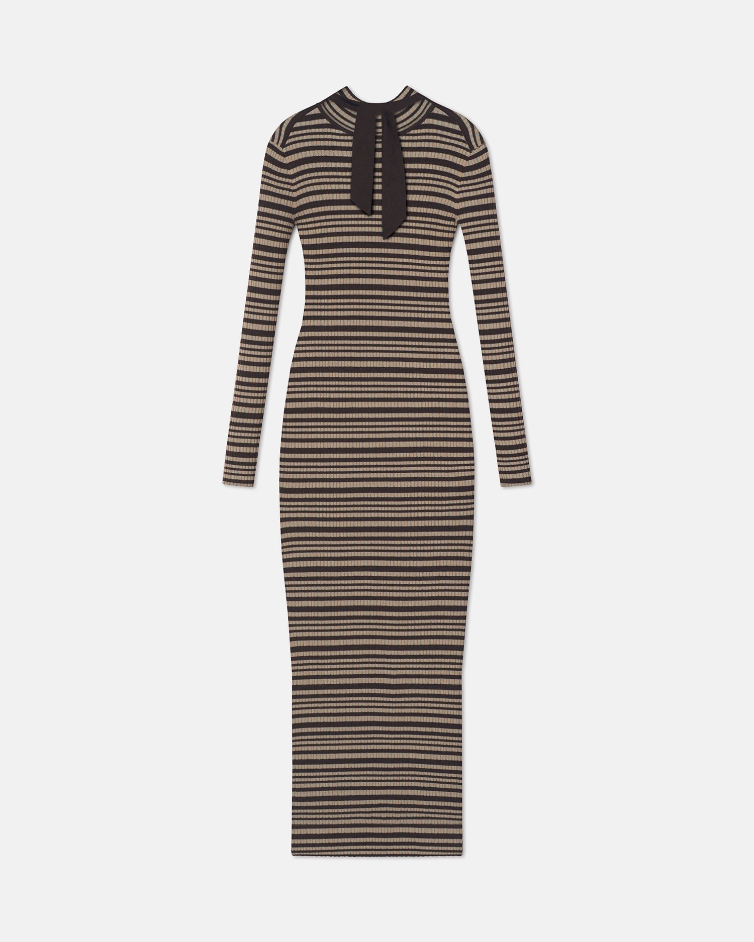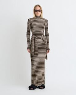 A Nanushka Mirell ruhája az Arella felső sziluettjét idézi, de hosszúkás formában. Finom merinó gyapjúból készült, kötött, garbónyakú maxi ruha, nyakkötővel és testhezálló ujjakkal.