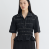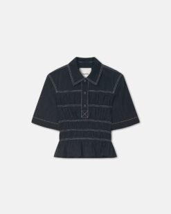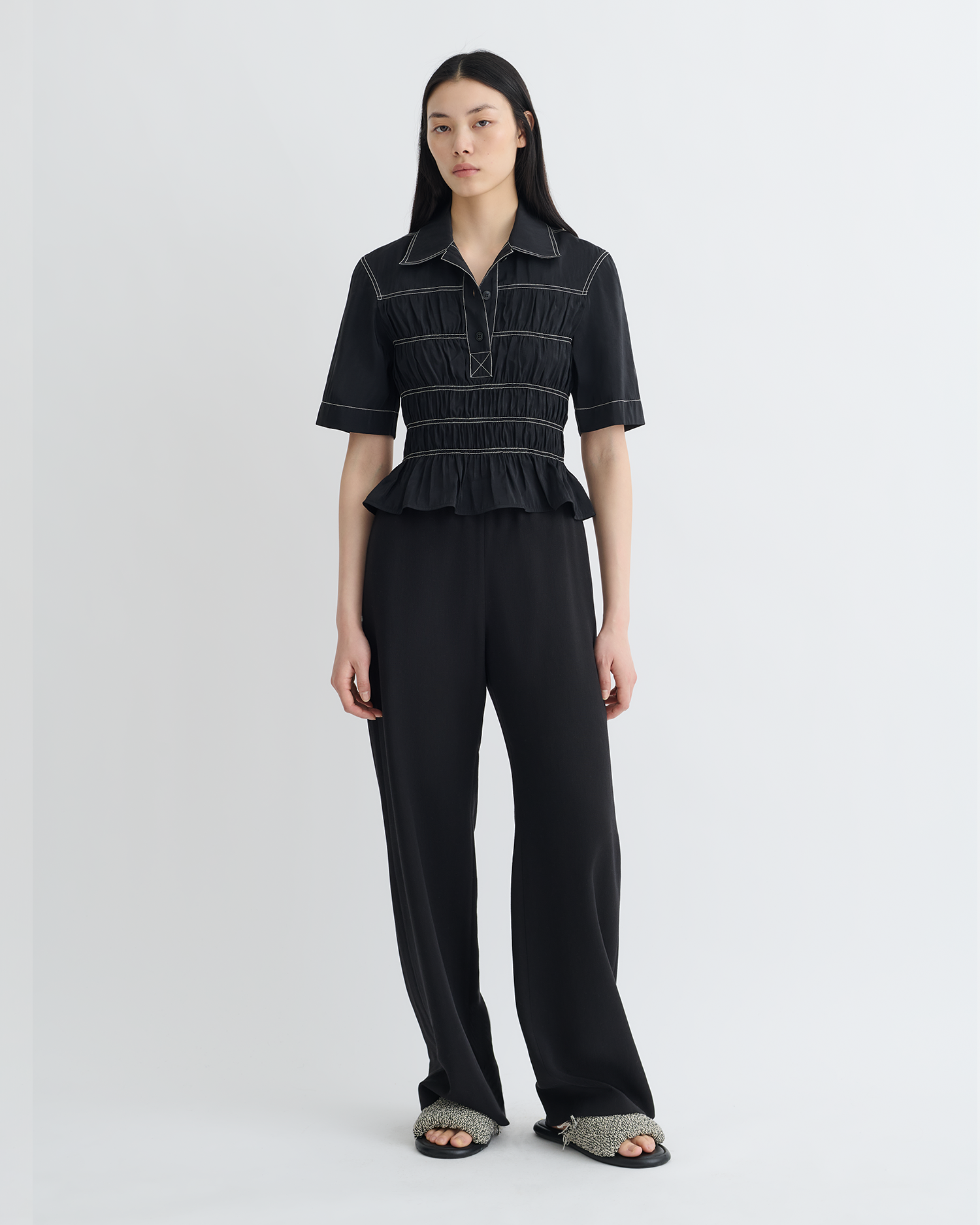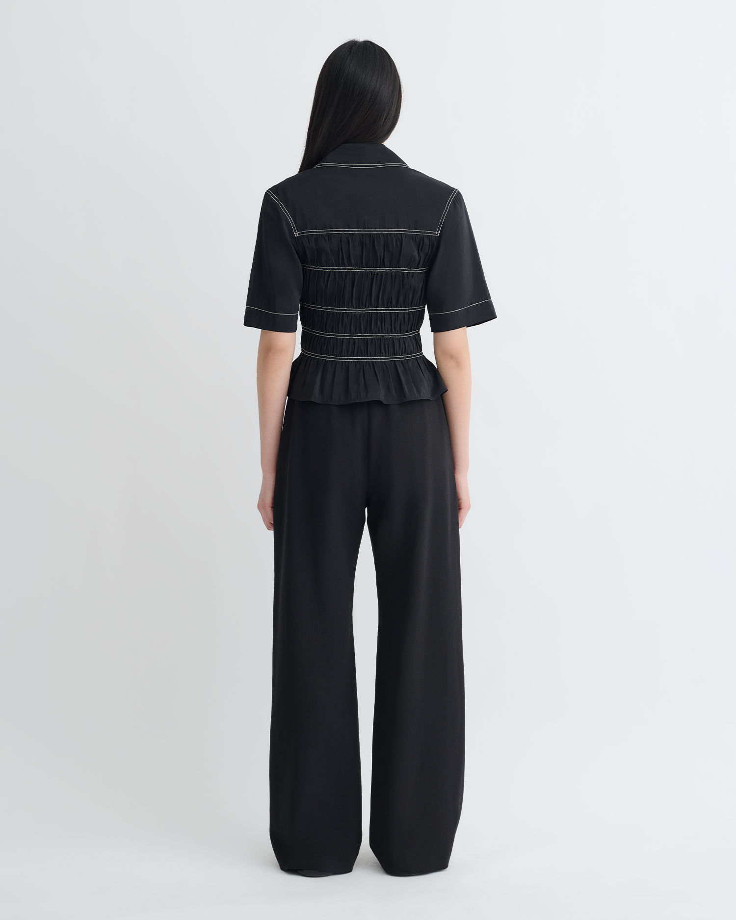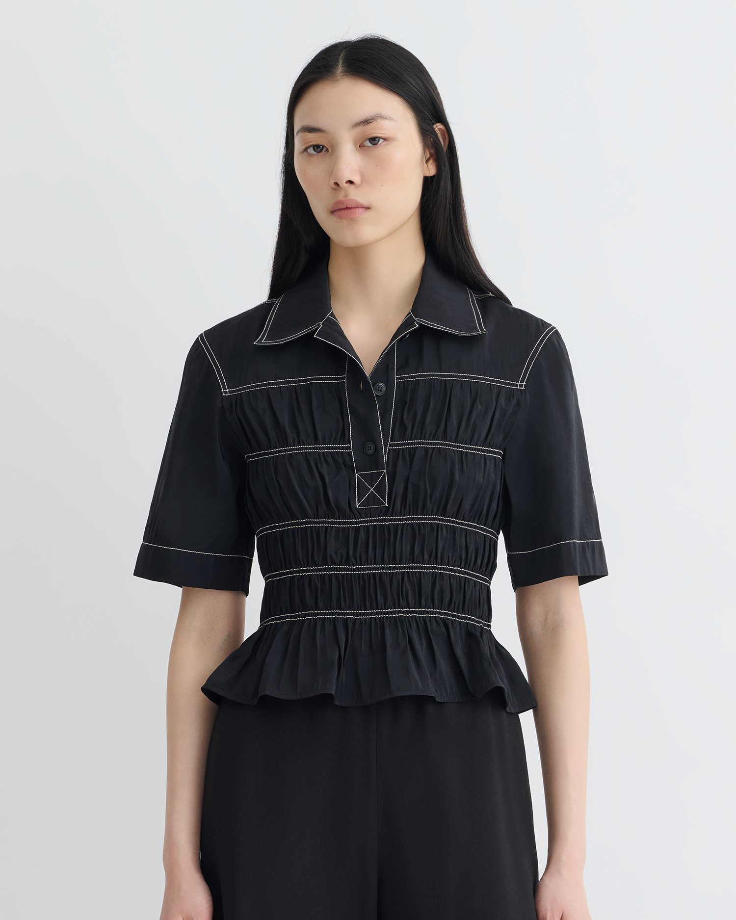 Az új sziluett, a Nairi ing játékos, mégis kifinomult. Fényes üvegpuplinból készült, kontrasztos fehér varrással és ráncolt derékkal.