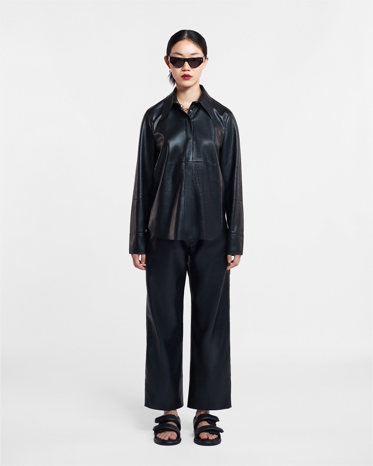 A Naum ing OKOBOR™-ból készült – egy exkluzív Nanushka anyagból, amelyet rugalmas érzetéért, praktikusságáért és állatkísérlet-mentes tulajdonságaiért nagyra értékelnek. Laza szabású, minimális részletgazdagsággal készült a letisztult kidolgozás érdekében.