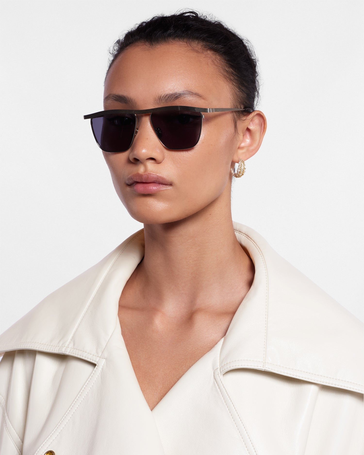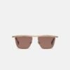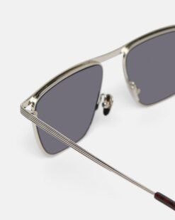 A Noran napszemüveg elegáns ezüstszínű fémből készült, modern homlokrész-kiegészítővel. A sötét lencsék teljes spektrumú védelmet nyújtanak.