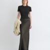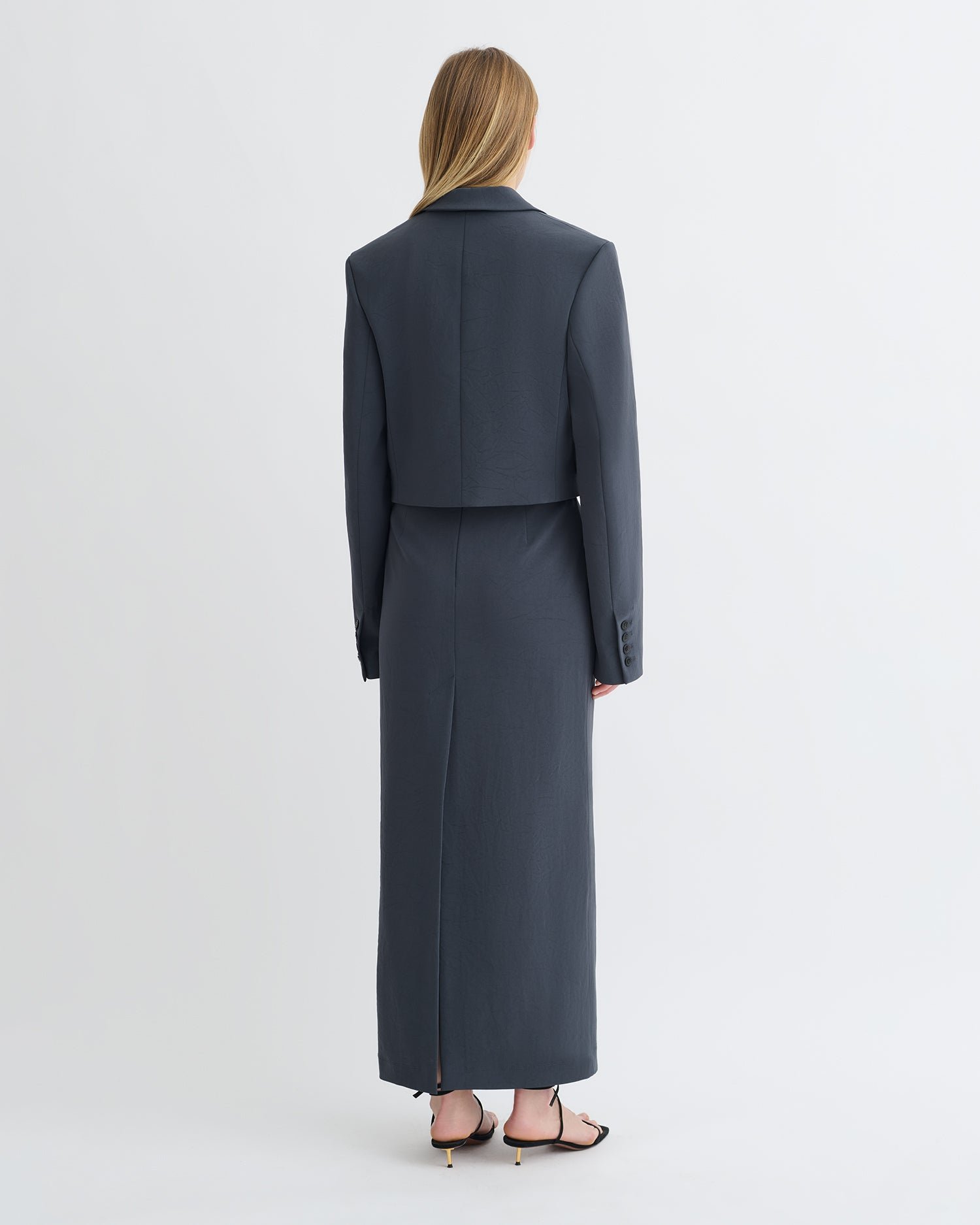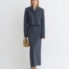 Az áramvonalas és minimalista Nya szoknya a 90-es évek irodai viseletének esztétikájából inspirálódott. Könnyű papírjersey anyagból készült, poroskék árnyalatban, egyszerű oszlopos sziluettel. Viseld a hozzá illő Sitara felsővel a visszafogott kifinomultságért.