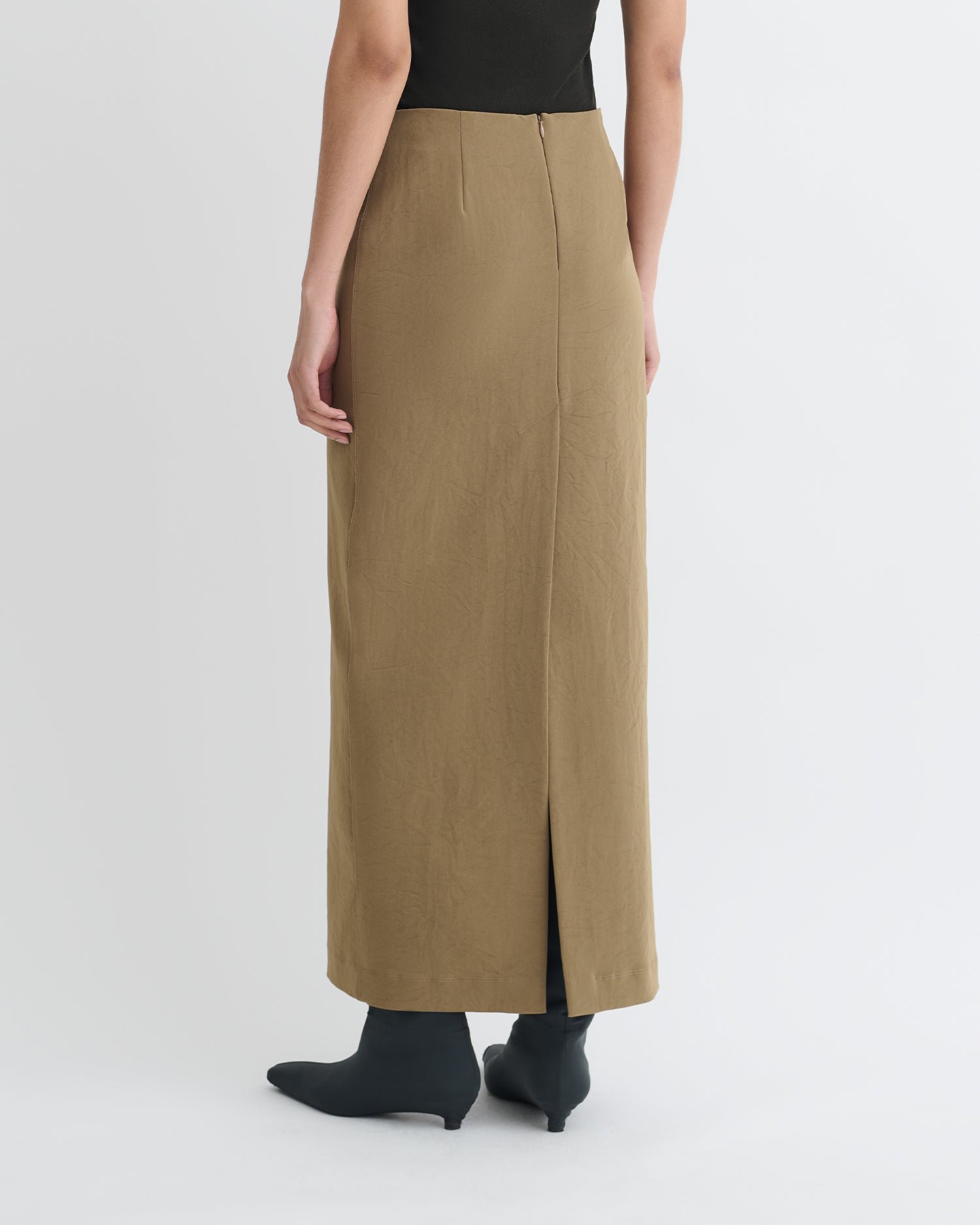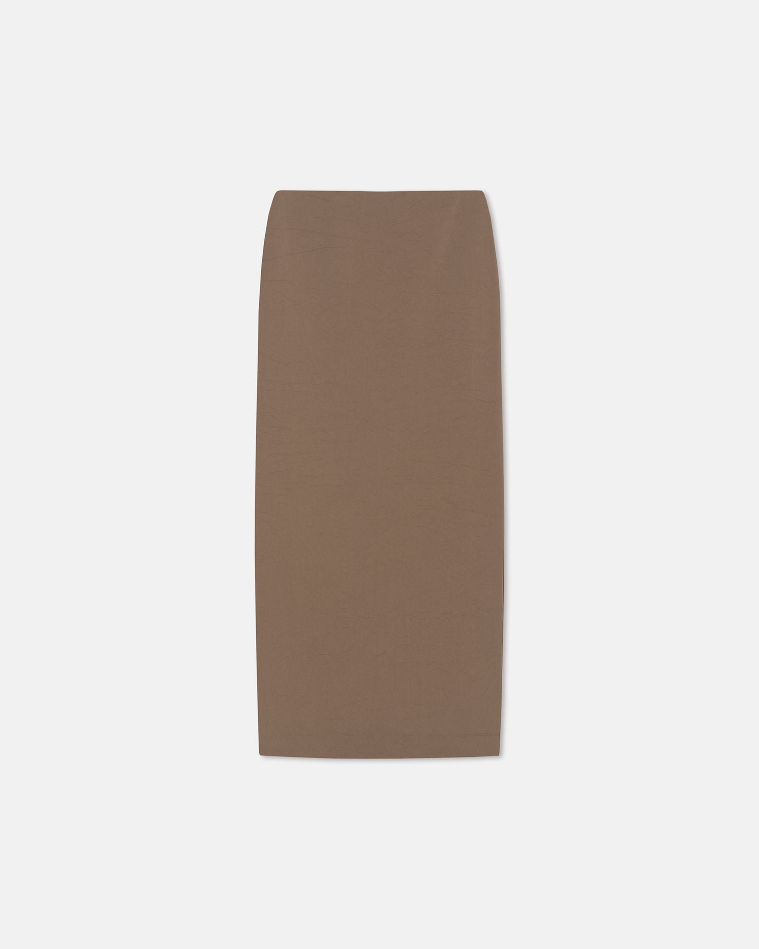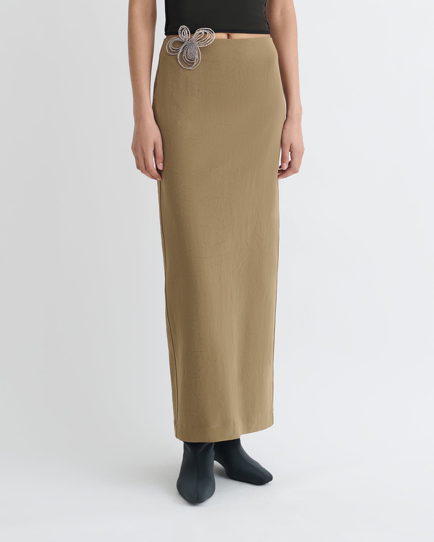 A letisztult és minimalista Nya szoknya a 90-es évek irodai viseletének esztétikájából inspirálódott. Könnyű papírjersey anyagból készült, barna színben, egyszerű oszlopos sziluettel. Viseld a hozzá illő Sitara felsővel a visszafogott kifinomultságért.