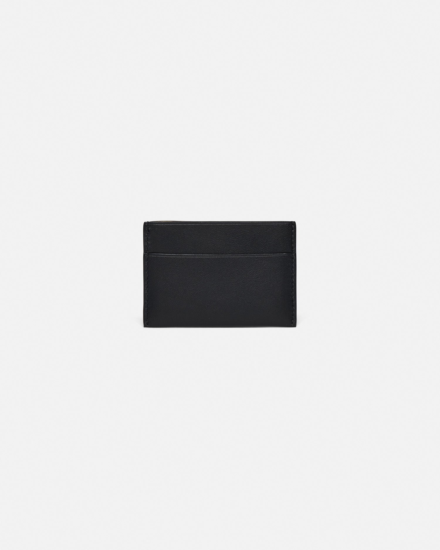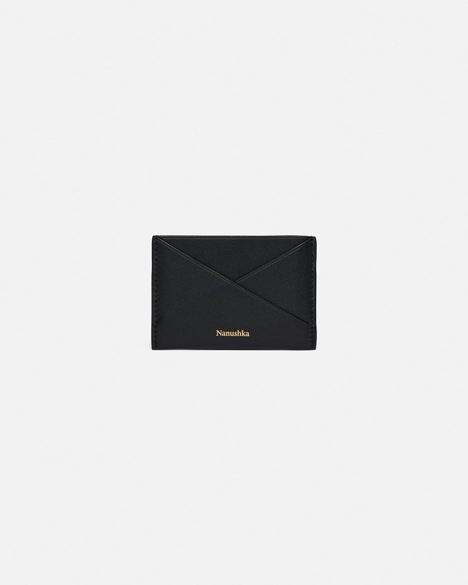 A Nanushka jellegzetes origami stílusában tervezett kártyatartó strukturált bőrből készült. A fekete külsőt a jellegzetes holdsugár belső díszíti, amelyet egy vakon benyomott Nanushka felirat díszít.