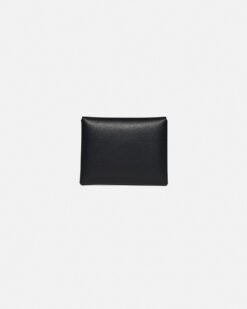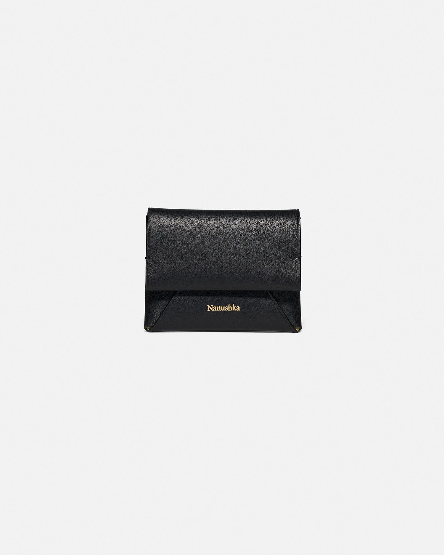 A Nanushka jellegzetes origami stílusában tervezett, összehajtott kártyatartó laposra hajtható és strukturált bőrből készült. A fekete külsőt a jellegzetes holdsugár belső díszíti, amelyet egy vakon dombornyomott Nanushka felirat és szálcsiszolt arany szerelékek egészítenek ki.