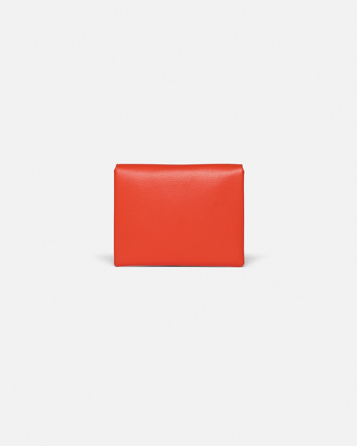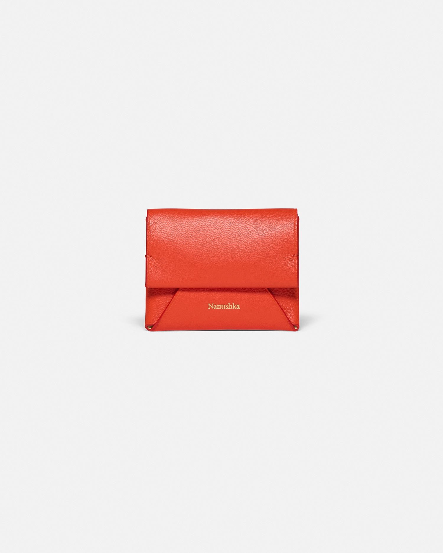 A Nanushka jellegzetes origami stílusában tervezett, összehajtott kártyatartó laposra hajtható és strukturált bőrből készült. A piros külsőt a jellegzetes holdsugár belső díszíti, amelyet egy vakon dombornyomott Nanushka felirat és szálcsiszolt arany szerelékek egészítenek ki.