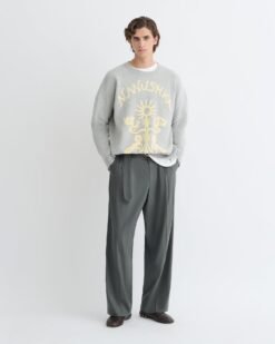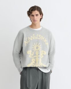 Az Oswin pulóver jacquard szövésű, Nanushka logóval és puha, krémszínű frottírból készült, művészi motívumokkal. Merinógyapjúból kötött, így bő, túlméretezett szabású.