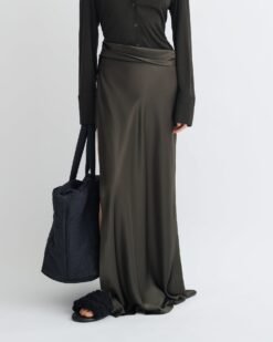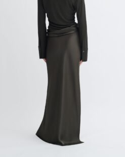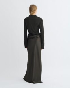 A 2025-ös őszi kollekcióban is folytatódik az anyagblokkolás, amely a könnyedséget az eleganciával ötvözi. A Scylla ruha egy sötétzöld hálós jersey ingből és egy fekete, slip-on szatén szoknyából áll – a drapézott derék rendkívül előnyös.